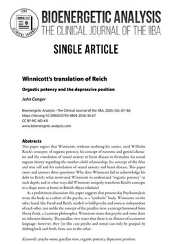 Questo articolo sostiene che Winnicott, senza citare la fonte, abbia utilizzato il concetto di Wilhelm Reich di potenza orgasmica, il suo concetto di carattere nevrotico e genitale e la correlazione tra ansia sessuale e cardiopatia per formulare la sua teoria dell’orgasmo sessuale riguardante la relazione madre-bambino, il suo concetto di falso e vero sé e la sua correlazione tra ansia sessuale e cardiopatia. Questo articolo solleva e risponde a tre domande: perché Winnicott non riconosce il suo debito nei confronti di Reich; cosa lo ha spinto a comprendere la «potenza orgasmica” in modo così approfondito; e in che modo Winnicott ha trasformato in modo unico i concetti di Reich in una forma più congeniale alle relazioni oggettuali britanniche? Come discussione preliminare, questo articolo suggerisce che la psicoanalisi odierna tratta il corpo come un sottoinsieme della psiche, come un corpo «simbolico”. Winnicott, d’altra parte, come Freud e Reich, tendeva a considerare psiche e soma indipendenti l’uno dall’altro, non diversamente dal concetto di parallasse, un concetto preso in prestito da Slavoj Žižek, un filosofo lacaniano. Winnicott afferma che psiche e soma non condividono alcuna identità intrinseca. La parallasse afferma che esiste l’illusione di un linguaggio comune; tuttavia, essi (in questo caso psiche e soma) possono essere compresi solo passando avanti e indietro, dall‘uno all‘altro.