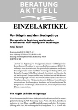 Die Begleitung von Einzelpersonen, Paaren oder Mehrpersonenkonstellationen (Polykülen) in konsensuell nicht-monogamen (KNM) Beziehungen kann beratende und therapeutische Fachpersonen vor Herausforderungen stellen und zu Konflikten in ihrer eigenen Haltung führen, zum Beispiel in Bezug auf Ethik, Moral oder auch Gewohnheit und Expertise. Da die Nachfrage nach Therapie und Beratung für Menschen in KNM-Konstellationen stetig steigt, soll dieser Praxisbericht ein therapeutisch-beraterisches Vorgehen entlang einer Fallvignette skizzieren. Ziel ist es, Fachkräfte darin zu unterstützen, Berührungsängste abzubauen und sich vorbereitet auf die komplexe und vielschichtige Arbeit einzulassen, sowie den professionellen Diskurs voranzutreiben.