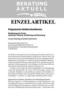 25 Jahre Herausgeberschaft Beratung aktuellSonja Bröning, Rahel Korinth & Agostino Mazziotta S. 15–33Was wissen wir über Polyamorie als Beziehungsmodell? (PDF)
