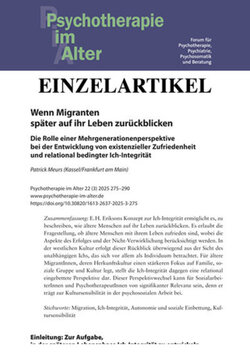 E. H. Erikson’s concept of ego integrity enables us to understand how older people reflect on their lives. It enables us to consider whether they are satisfied with their lives, taking into account both success and non-achievement. In Western culture, this retrospective view is predominantly taken from the perspective of the independent ego, which views the individual as separate from others. However, for older migrants whose culture of origin places a stronger focus on family, social groups and culture, ego integrity represents a relationally embedded perspective. This change in perspective is of significant relevance to social workers and psychotherapists, as it promotes cultural sensitivity in psychosocial work.