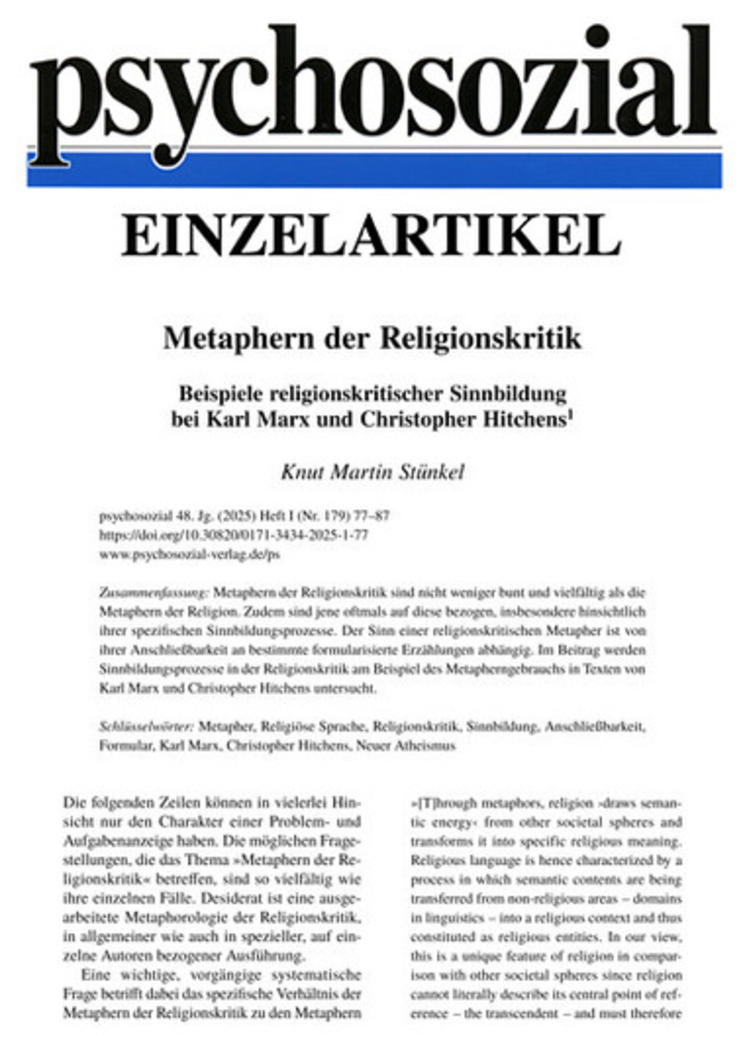 Metaphern der Religionskritik sind nicht weniger bunt und vielfältig als die Metaphern der Religion. Zudem sind jene oftmals auf diese bezogen, insbesondere hinsichtlich ihrer spezifischen Sinnbildungsprozesse. Der Sinn einer religionskritischen Metapher ist von ihrer Anschließbarkeit an bestimmte formularisierte Erzählungen abhängig. Im Beitrag werden Sinnbildungsprozesse in der Religionskritik am Beispiel des Metapherngebrauchs in Texten von Karl Marx und Christopher Hitchens untersucht.
