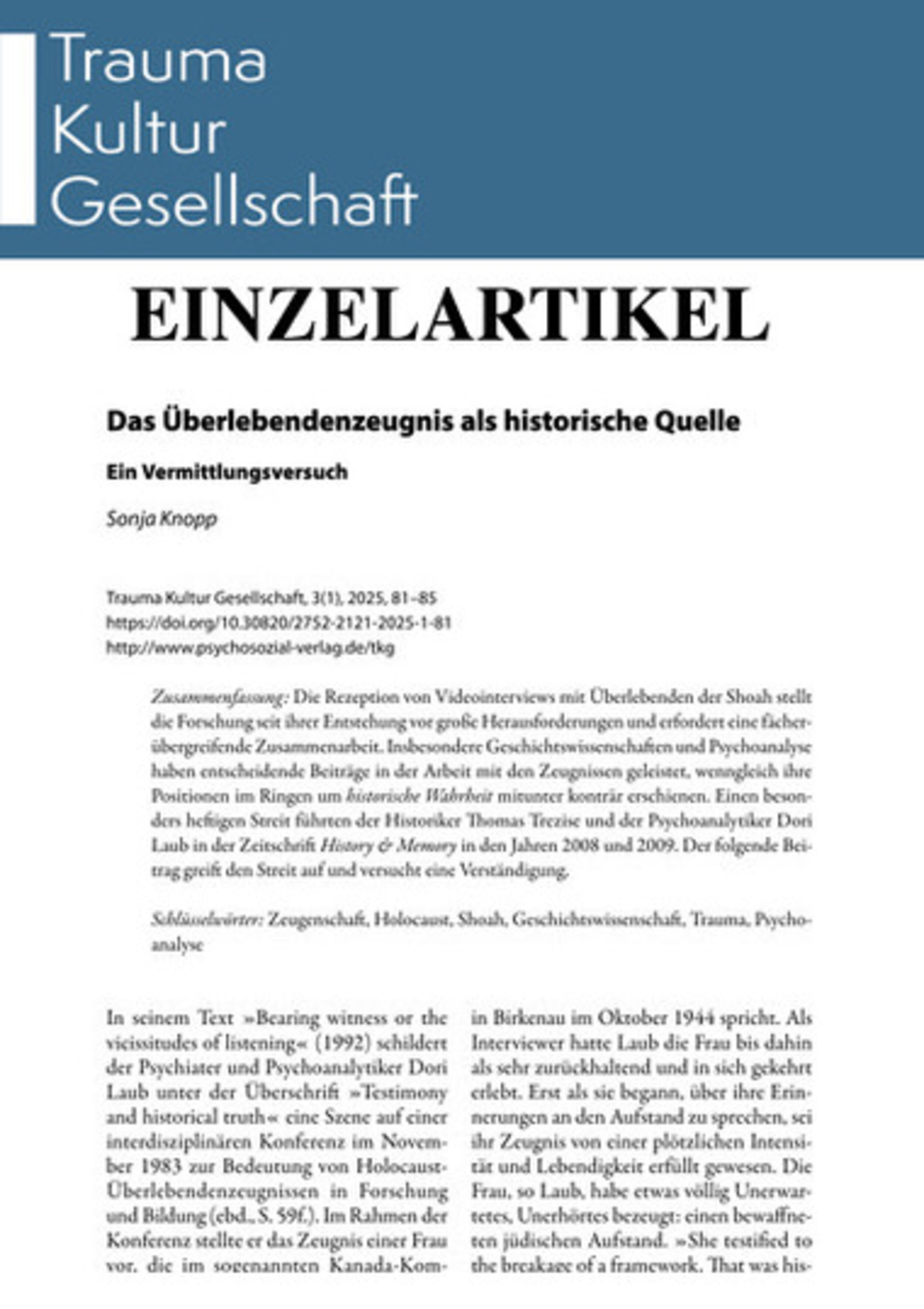 Die Rezeption von Videointerviews mit Überlebenden der Shoah stellt die Forschung seit ihrer Entstehung vor große Herausforderungen und erfordert eine fächerübergreifende Zusammenarbeit. Insbesondere Geschichtswissenschaften und Psychoanalyse haben entscheidende Beiträge in der Arbeit mit den Zeugnissen geleistet, wenngleich ihre Positionen im Ringen um historische Wahrheit mitunter konträr erschienen. Einen besonders heftigen Streit führten der Historiker Thomas Trezise und der Psychoanalytiker Dori Laub in der Zeitschrift History & Memory in den Jahren 2008 und 2009. Der folgende Beitrag greift den Streit auf und versucht eine Verständigung.