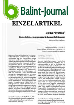 Musical principles – particularly the structural principle of polyphony, that is, multi-voicedness, as well as the formal and compositional principle of the fugue – can serve as analogies for understanding psychodynamic processes in Balint group work. The »music of the group« emerging during Balint group work and leadership, with its movements of tension, resonance, and meaning, is linked, among other things, to the concept of »diagonal listening« as described by Mahnkopf (2023). This perspective is further complemented by theoretical considerations of Balint group work and psychodynamic concepts such as Stern’s (2019) »dynamic vitality forms« and Foulke’s concept of the »group-matrix« (1986, 1990). The article furthermore discusses the possibility of musical analogies and »musical listening« to relationships in Balint group work and how, in doing so, the professional attitude, identity, and intervention practices of Balint group leaders may be expanded.