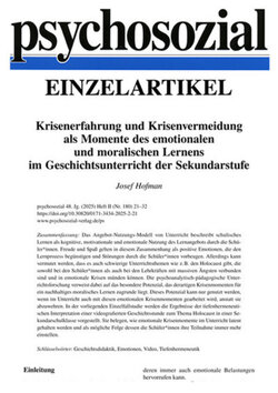 Überlegungen zu psychoanalytisch-pädagogischer Professionalisierung im 21. JahrhundertJosef HofmanS. 21–32Krisenerfahrung und Krisenvermeidung als Momente des emotionalen und moralischen Lernens im Geschichtsunterricht der Sekundarstufe (PDF)