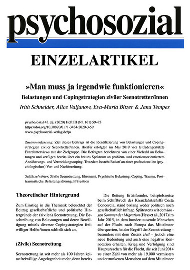Ziel dieses Beitrags ist die Identifizierung von Belastungen und Copingstrategien ziviler Seenotretter/innen. Hierfür erfolgten im Mai 2019 vier leitfadengestützte Einzelinterviews mit der Zielgruppe. Die Befragten berichteten von einer Vielzahl an Belastungen und verfügen bereits über ein breites Spektrum an problemund emotionsorientiertem Annäherungsund Vermeidungscoping. Trotzdem besteht Bedarf an einer professionellen (psychologischen) Vorund Nachbereitung.