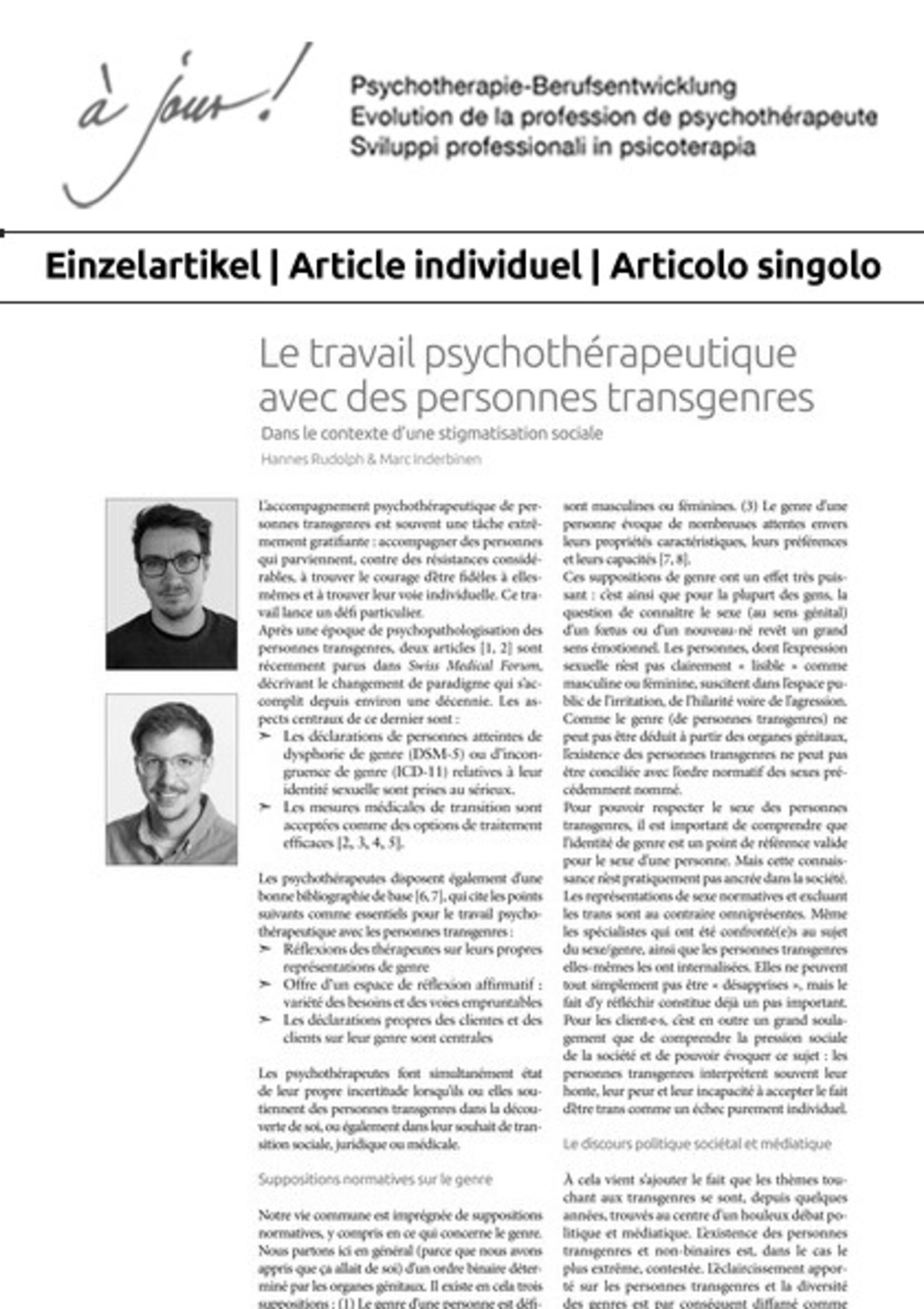 Hannes Rudolph & Marc Inderbinen S. 44–48Le travail psychothérapeutique avec des personnes transgenres (PDF)