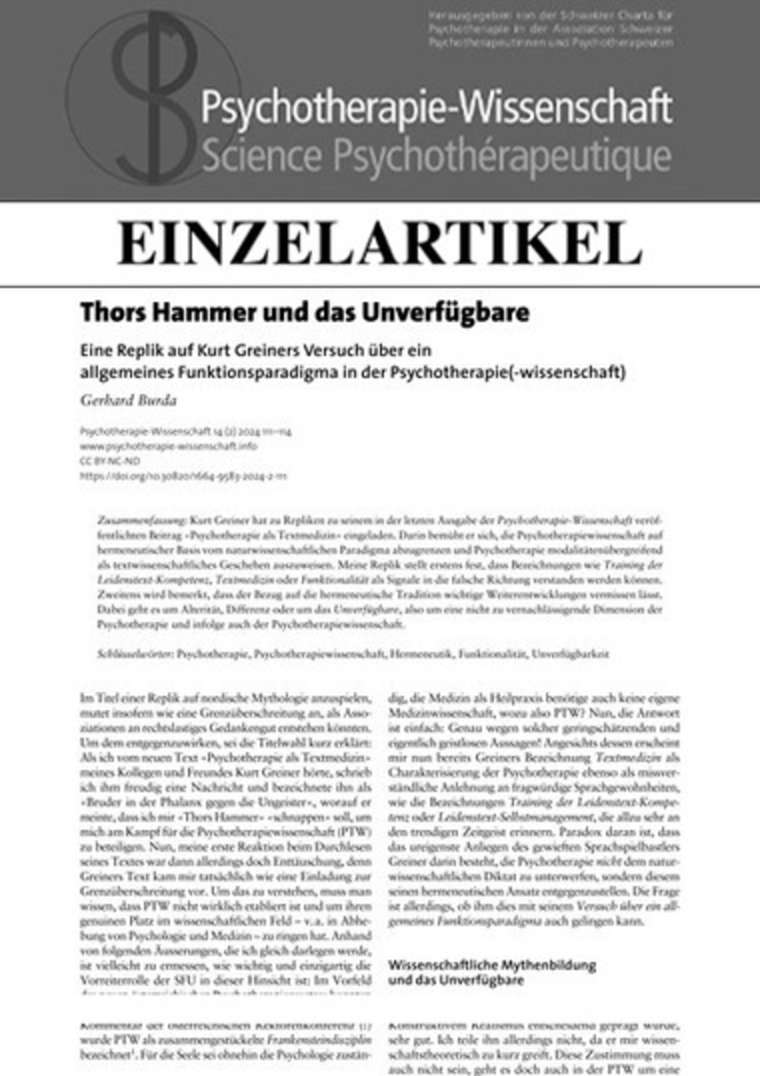 Eine Replik auf Kurt Greiners Versuch über ein allgemeines Funktionsparadigma in der Psychotherapie(-wissenschaft)Gerhard BurdaS. 115Le marteau de Thor et l’indisponible (PDF)