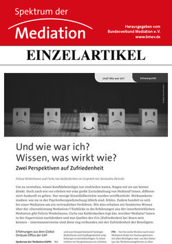 Um zu verstehen, womit Konfliktbeteiligte (un-)zufrieden waren, fragen wir sie am besten direkt. Doch nach wie vor erleben wir eine große Zurückhaltung von Mediand*innen, differenziert Auskunft zu geben. Nur wenige Einzelfallberichte wurden veröffentlicht. Wirksamkeitsstudien, wie sie in der Psychotherapieforschung üblich sind, fehlen. Zudem handelt es sich bei einer Mediation um ein vertrauliches Verfahren. Wie also erhalten wir fundiertes Wissen über die »Dienstleistung Mediation«? Einblicke in die Erfahrungen aus der innerbetrieblichen Mediation gibt Felicia Winkelmann. Carla van Kaldenkerken legt dar, worüber Mediator*innen in der Supervision nachdenken und was Quellen der (Un-)Zufriedenheit bei ihnen sein können – interessanterweise sind diese eng verbunden mit der Zufriedenheit der Beteiligten.
