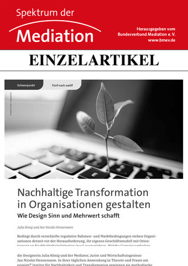 Bedingt durch verschärfte regulative Rahmenund Marktbedingungen stehen Organisationen derzeit vor der Herausforderung, ihr eigenes Geschäftsmodell mit Orientierung an Nachhaltigkeitskriterien (neu) auszurichten. Welche Gemeinsamkeiten damit verbundene Transformationsprozesse mit nachhaltigem Design teilen, erläutern die Designerin Julia König und der Mediator, Jurist und Wirtschaftsingenieur Jan Nicolai Hennemann. In ihrer täglichen Anwendung in Theorie und Praxis am ecosign® Institut für Nachhaltigkeit und Transformation gewinnen sie methodische Werkzeuge, die es ermöglichen, die Themen Nachhaltigkeit und Resilienz in und für Organisationen zu verknüpfen und so Sinn und Mehrwerte zu generieren.