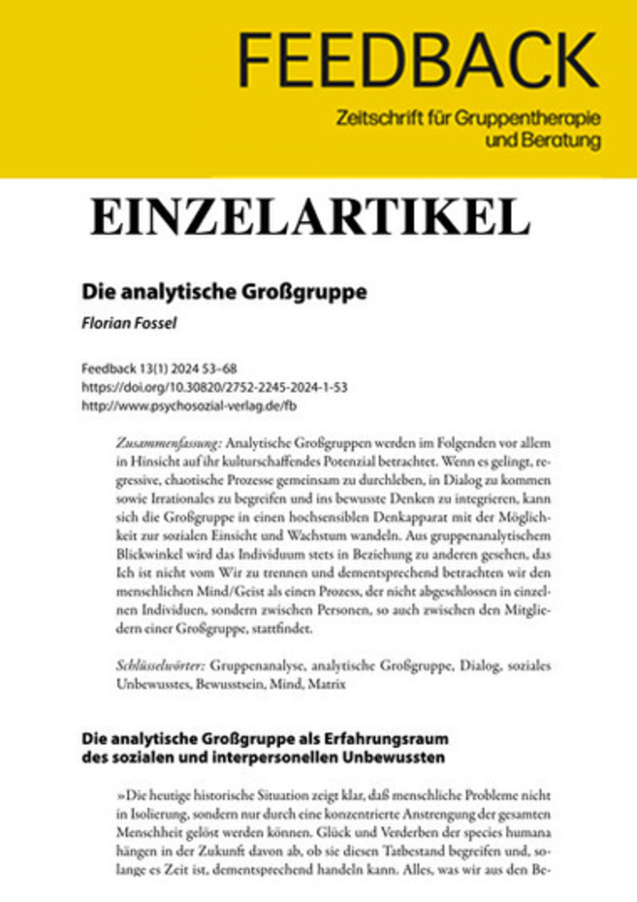 Rationale Gedanken zur LiebeGünter DietrichS. 101–103Rezension von: Institut für Gruppenanalyse Heidelberg e.V. (Hrsg.). (2023). Zeitschrift Gruppenanalyse. Heft 2/23: Entfaltungen der Gruppenanalyse (PDF)