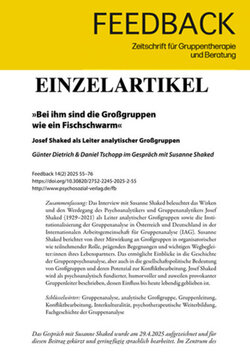Das Interview mit Susanne Shaked beleuchtet das Wirken und den Werdegang des Psychoanalytikers und Gruppenanalytikers Josef Shaked (1929–2021) als Leiter analytischer Großgruppen sowie die Institutionalisierung der Gruppenanalyse in Österreich und Deutschland in der Internationalen Arbeitsgemeinschaft für Gruppenanalyse (IAG). Susanne Shaked berichtet von ihrer Mitwirkung an Großgruppen in organisatorischer wie teilnehmender Rolle, prägenden Begegnungen und wichtigen Wegbegleiter:innen ihres Lebenspartners. Das ermöglicht Einblicke in die Geschichte der Gruppenpsychoanalyse, aber auch in die gesellschaftspolitische Bedeutung von Großgruppen und deren Potenzial zur Konfliktbearbeitung. Josef Shaked wird als psychoanalytisch fundierter, humorvoller und zuweilen provokanter Gruppenleiter beschrieben, dessen Einfluss bis heute lebendig geblieben ist.