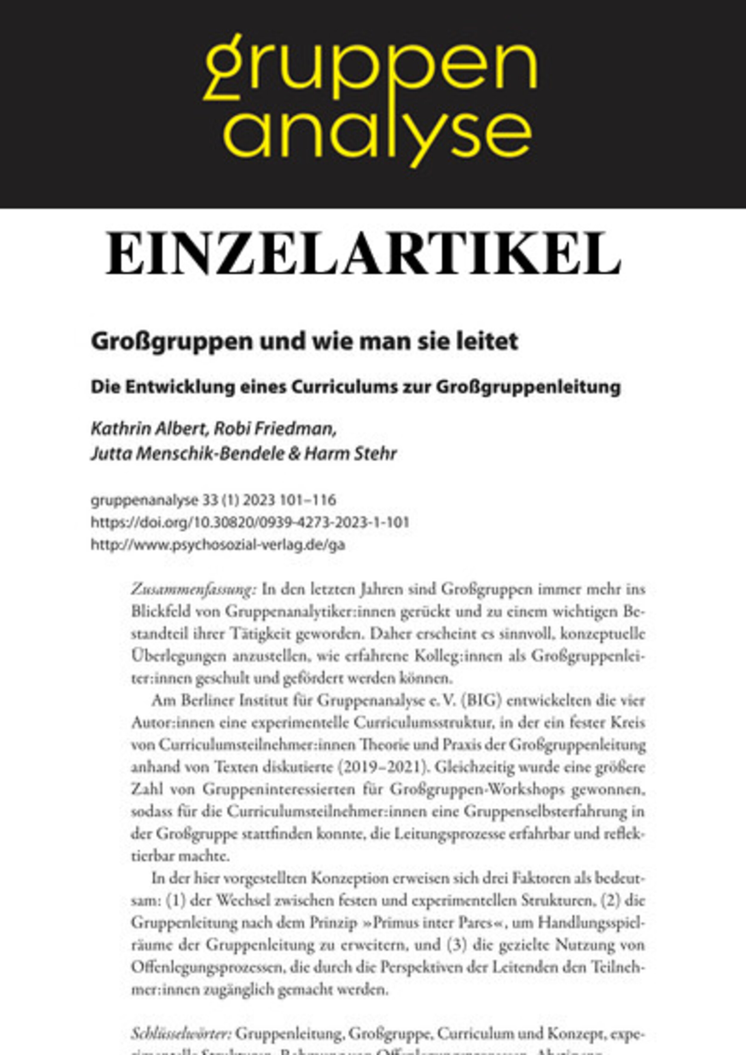 In recent years, large groups have increasingly come into the focus of group analysts and have become an important part of their work. It seems urgent to consider concepts with which experienced colleagues can be trained and supported as large group conductors. At the Berlin Institute for Group Analysis (BIG), the four authors developed an experimental curriculum structure in which a fixed group of curriculum participants discussed the theory and practice of large group facilitation on the basis of texts (2019–2021). At the same time, a larger number of people interested in large group workshops were recruited so that the curriculum participants could experience themselves in the large group and experience and reflect on conducting processes. In the concept presented here, three factors proved to be significant: (1) the alternation between fixed and experimental structures, (2) group leadership according to the principle of »primus inter pares« in order to expand the group leader’s scope of action, and (3) the targeted use of disclosure processes through which the perspectives of the conductors are made accessible to the participants.