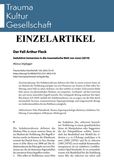 The seduction theory defines film in a broader sense as a medium of seduction and starts from two premises: Firstly, film itself is seduction; to see a film is to be seduced by it. And secondly, film always remains a phantom-like medium, a temporary ›Lichtspiel‹ on the screen that eludes material access. This paper analyzes the feature film Joker (US 2019) using seduction theory to show how the film enables an ambivalence experience for the audience through metamedial references, trauma-oriented character psychology, and contemporary references.