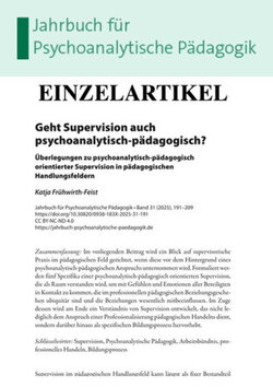 Überlegungen zu psychoanalytisch-pädagogisch orientierter Supervision in pädagogischen HandlungsfeldernNatascha Florence Bousa & Barbara Neudecker S. 213–233Der psychoanalytisch-pädagogische Blick auf pädagogische Praxis in wissenschaftlichen Qualifizierungsarbeiten (PDF)