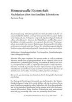 Psychoanalytische Familientherapie, 2014, 15(1), Nr. 28, 5-26Burkhard BrosigS. 27–37Homosexuelle Elternschaft. Nachdenken über eine familiäre Lebensform (PDF)