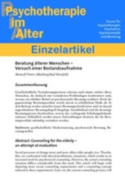 Gesellschaftliche Veränderungsprozesse erfassen auch immer stärker ältere Menschen, die dadurch mit veränderten Problemlagen konfrontiert sind, woraus ein erhöhter Bedarf an psychosozialer Beratung resultiert. Doch die gegenwärtige Beratungsrealität weicht davon in erheblichem Maße ab. Vor diesem Hintergrund werden zunächst neuere Beratungserfordernisse und ein darauf zugeschnittener Beratungsbegriff dargelegt. Anschließend wird die derzeitige Beratungspraxis beschrieben, soweit das vorliegende Erhebungsbefunde zulassen. Schließlich werden neuere Entwicklungen skizziert, die die Beratungsrealität zukünftig verändern werden.