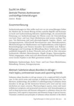 Suchterkrankungen im Alter stellen nach wie vor ein vernachlässigtes Gebiet der Medizin dar. In diesem Beitrag werden zunächst Begriffe und Konzepte zu Sucht und Suchtentstehung diskutiert. Epidemiologie, die unzureichende Erkennung von Suchterkrankungen bei Älteren sowie die Unterscheidung von Early Onsetund Late Onset-Alkoholismus sind weitere wichtige Themen. Von Bedeutung sind auch pharmakologische Aspekte, Absetzund Entzugssymptome, schleichende Intoxikationen unter Benzodiazepinen, Wechselwirkungen mit Medikamenten und Folgekrankheiten, wobei kognitive Beeinträchtigungen und Demenz besonders hervorzuheben sind. Rahmenbedingungen und Grundzüge der Behandlung älterer Suchtkranker werden ausführlich dargestellt. In dieser Übersicht wird auf alle im Alter relevanten Suchtmitteln (Alkohol, Benzodiazepine, illegale Drogen, Opiatanalgetika, Tabak) eingegangen, wobei auch sich abzeichnende künftige Entwicklungen sowie Gender-Aspekte in den Blick genommen werden.
