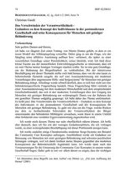 Behindertenpädagogik 2003, 42(1-2), 54-73Christian GaedtS. 74–88Das Verschwinden der Verantwortlichkeit. Gedanken zu dem Konzept des Individuums in der postmodernen Gesellschaft und seine Konsequenzen für Menschen mit geistiger Behinderung