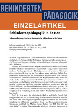 Schwerpunktthema: Barrieren für autistische Schüler:innen in der SchuleVera MoserS. 180–192Das schAUT Projekt: Materialien zur Reduktion von Barrieren für autistische Schüler:innen (PDF)