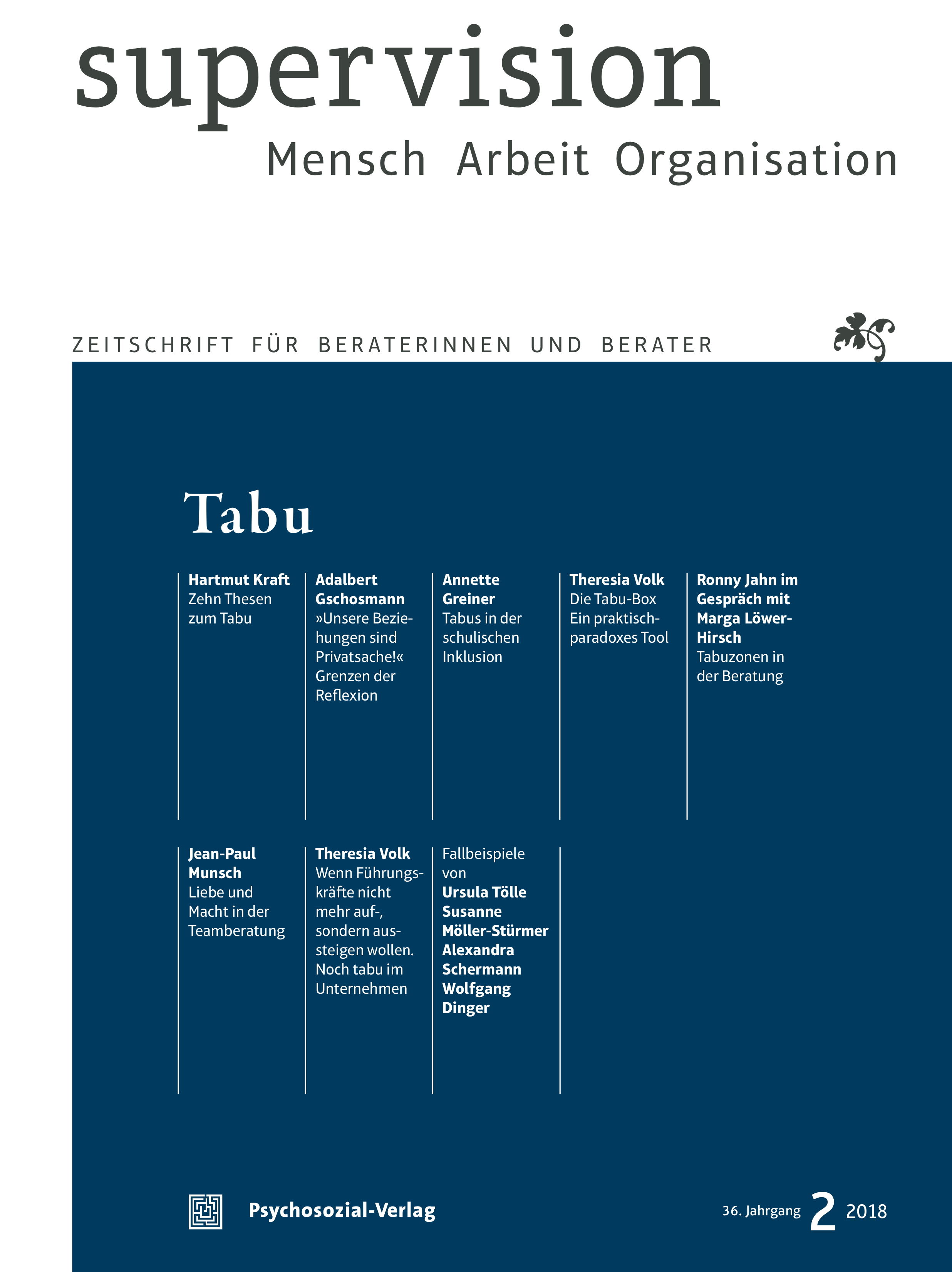 Supervision Jhg: 36, 2 (2018), 24-25Ronny Jahn & Marga Löwer-Hirsch S. 26–32Tabuzonen in der Beratung. Ronny Jahn im Gespräch mit Marga Löwer-Hirsch (PDF)